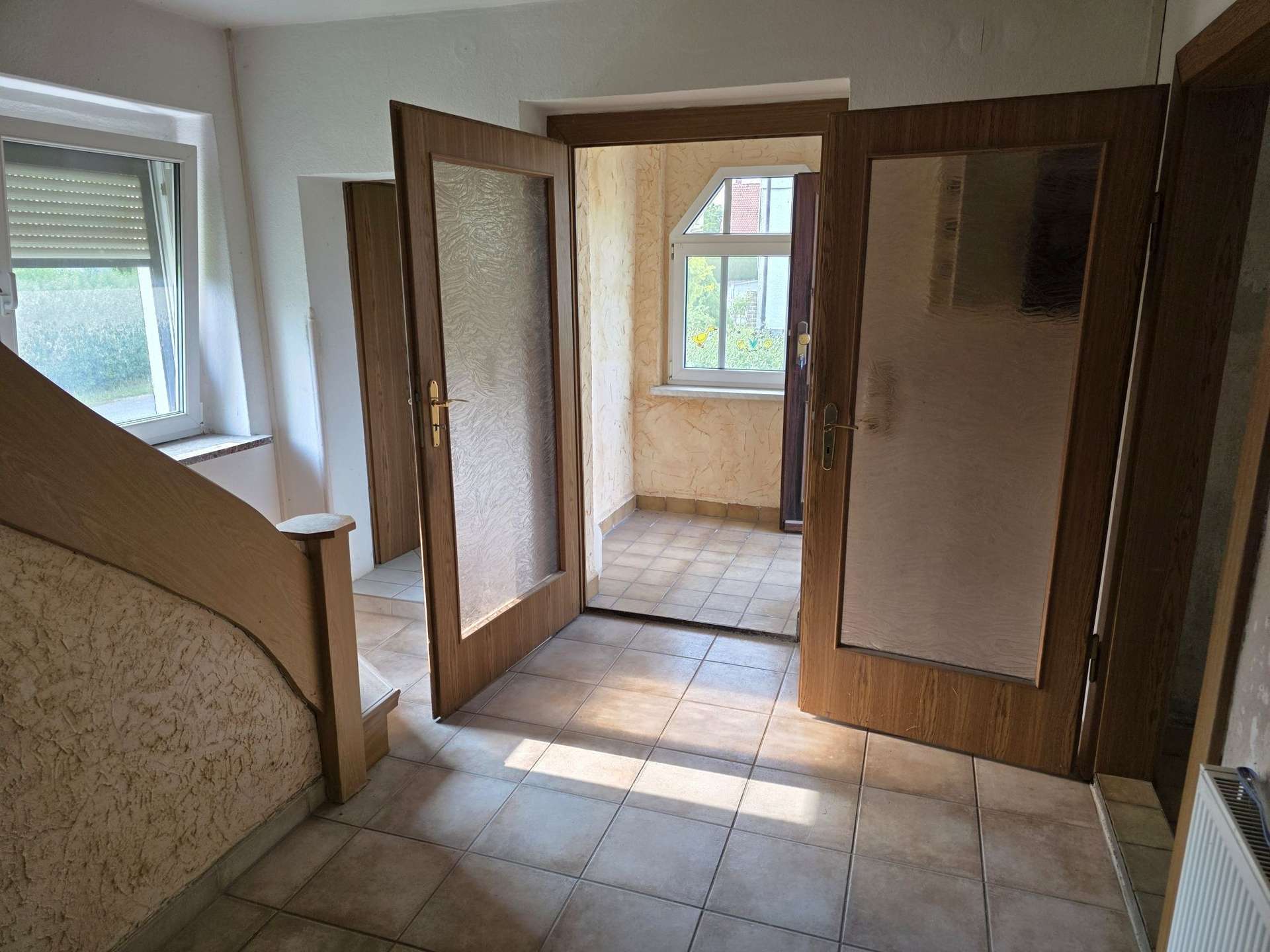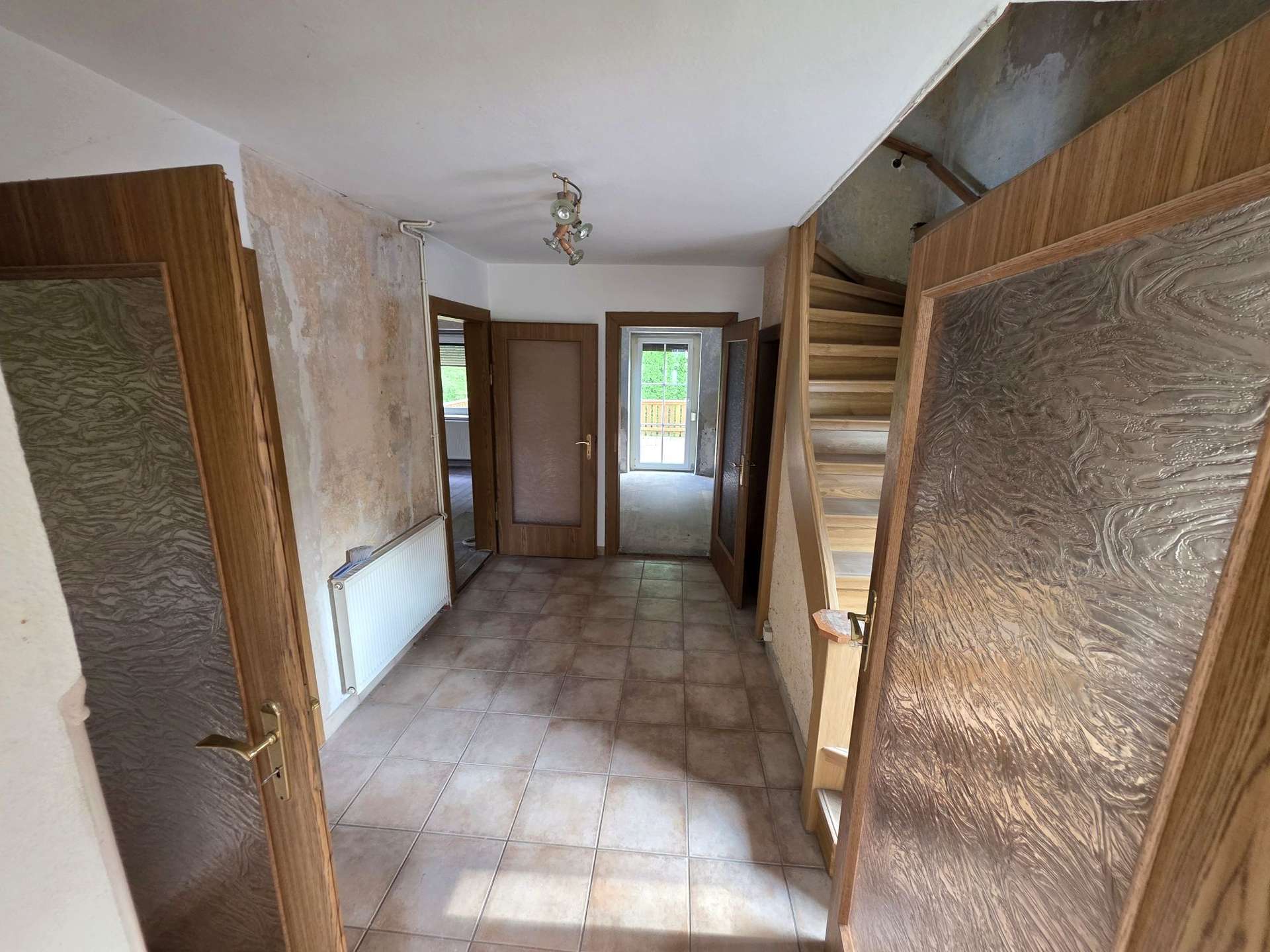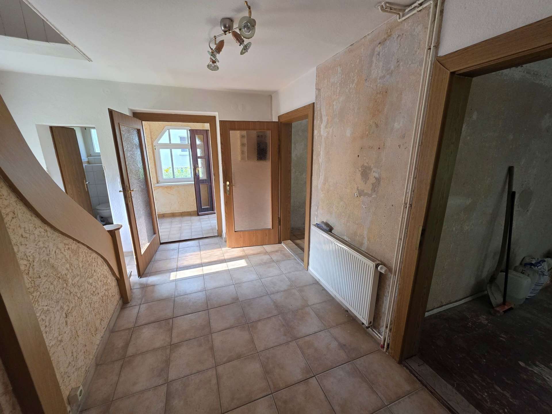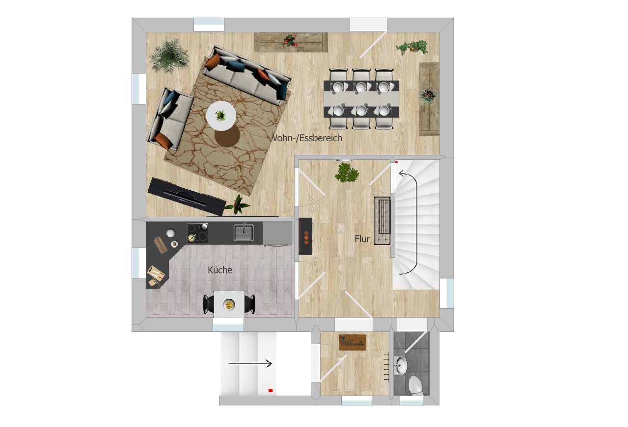 EG: Flur mit sep. WC, Wohnzimmer, Küche, Esszimmer mit Zugang zur Terrasse