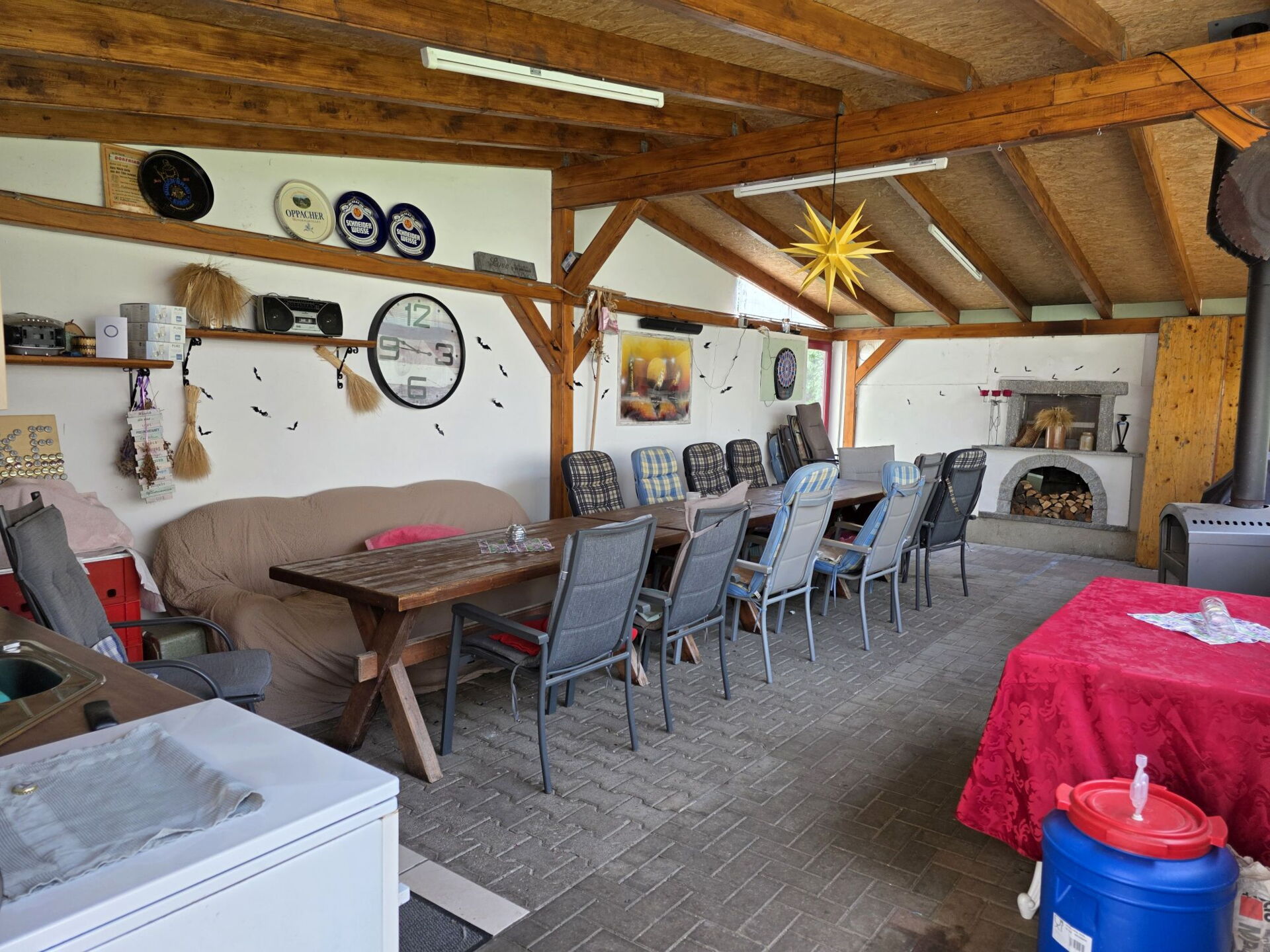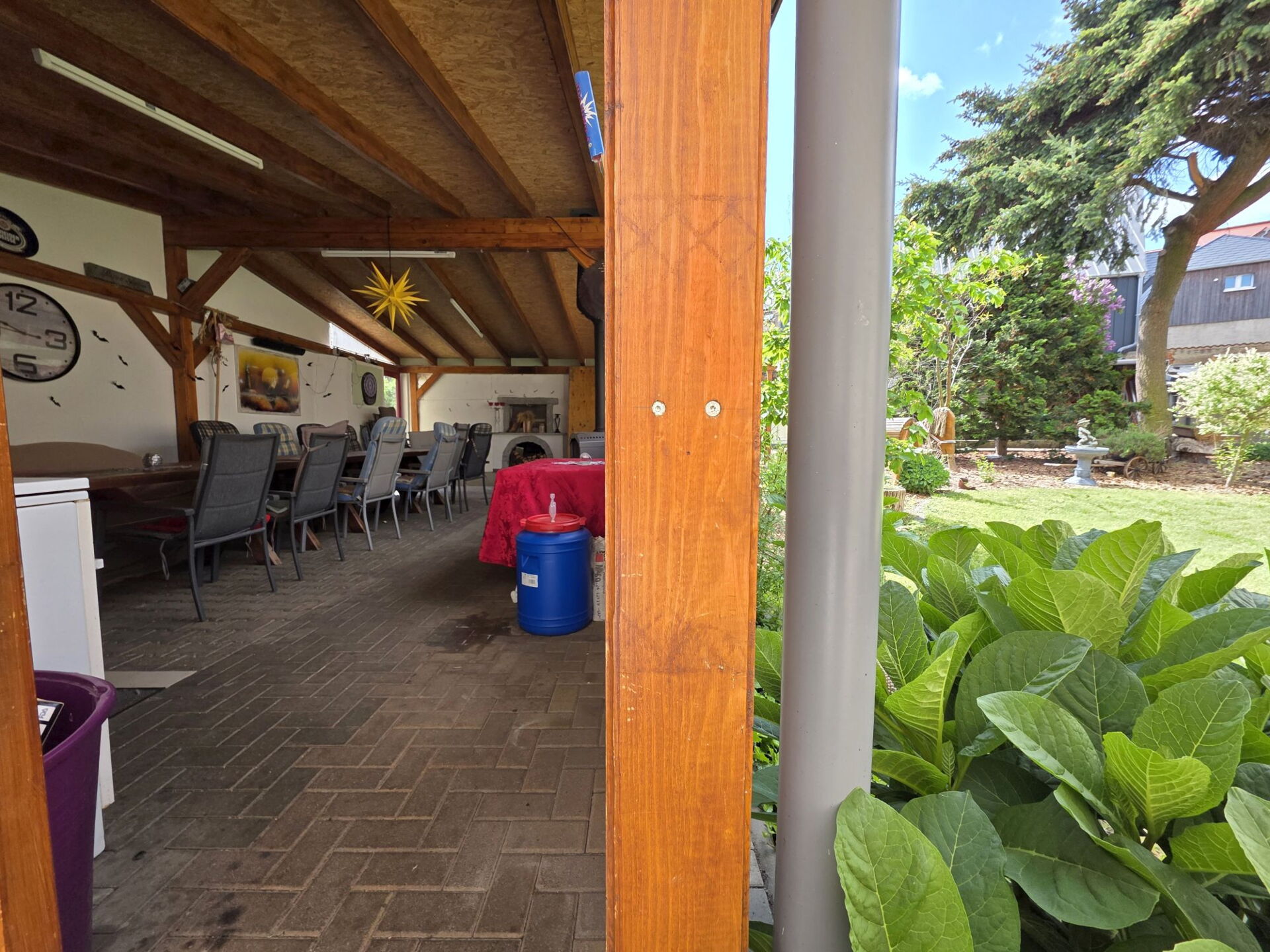 Auf der linken Seite des Innenhofs befindet sich ein überdachter "Partyraum", perfekt für Ihre Feierlichkeiten, zum Grillen oder um eine große Sylvester-Fete zu geben. Ausgestattet mit Kamin und Grill feiern Sie hier bei jedem Wetter.