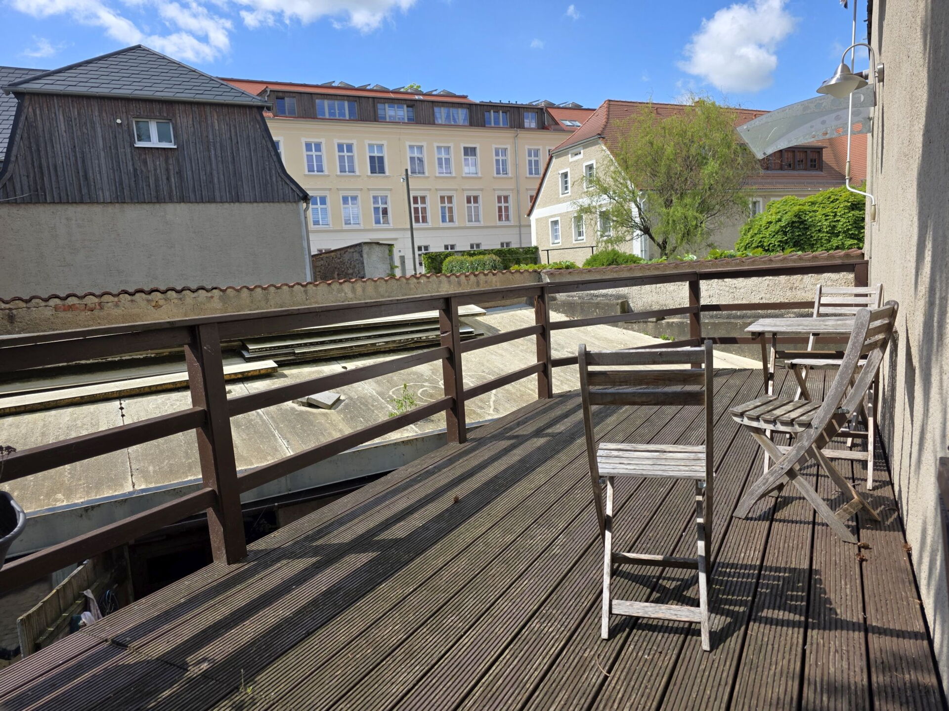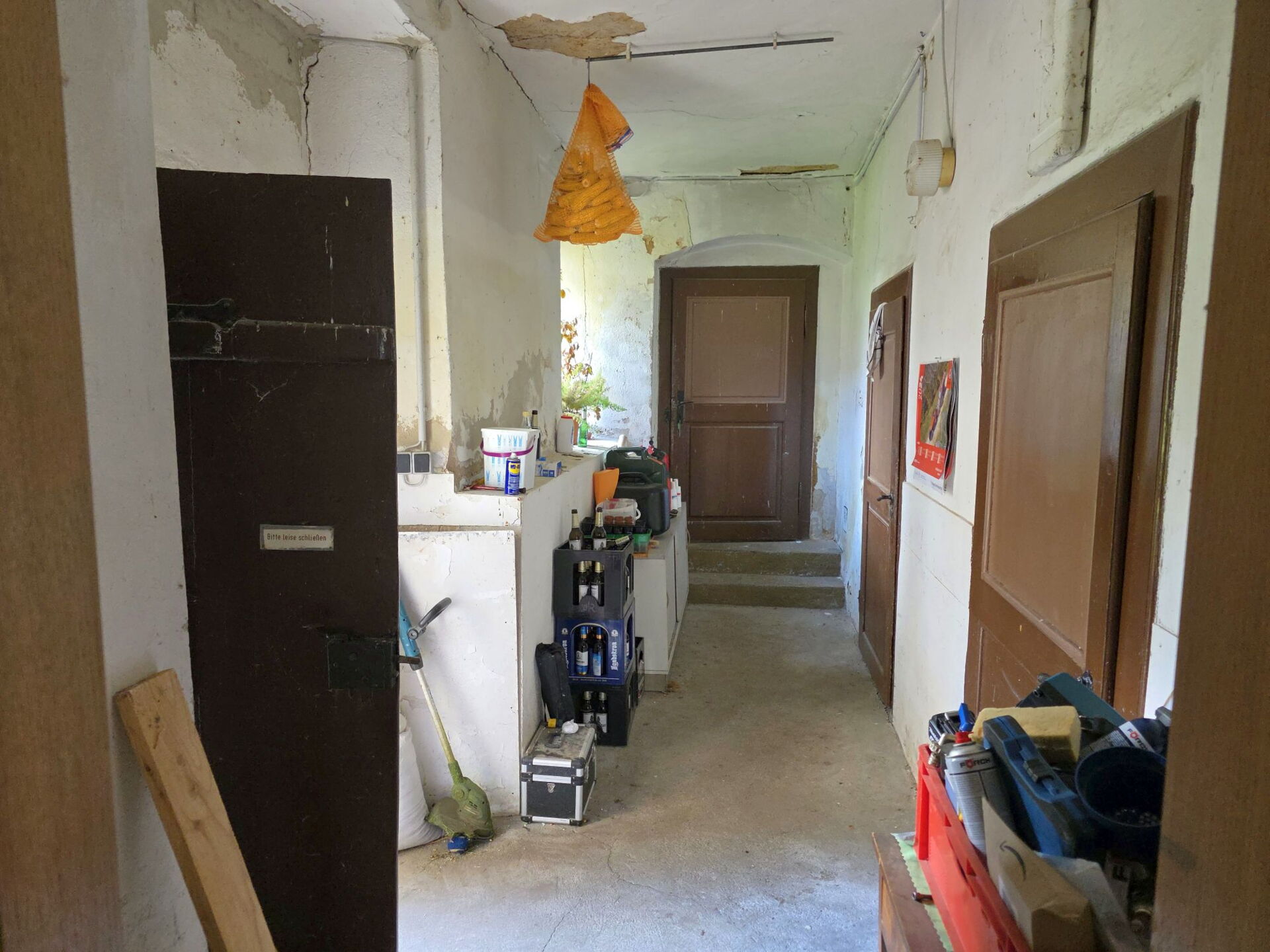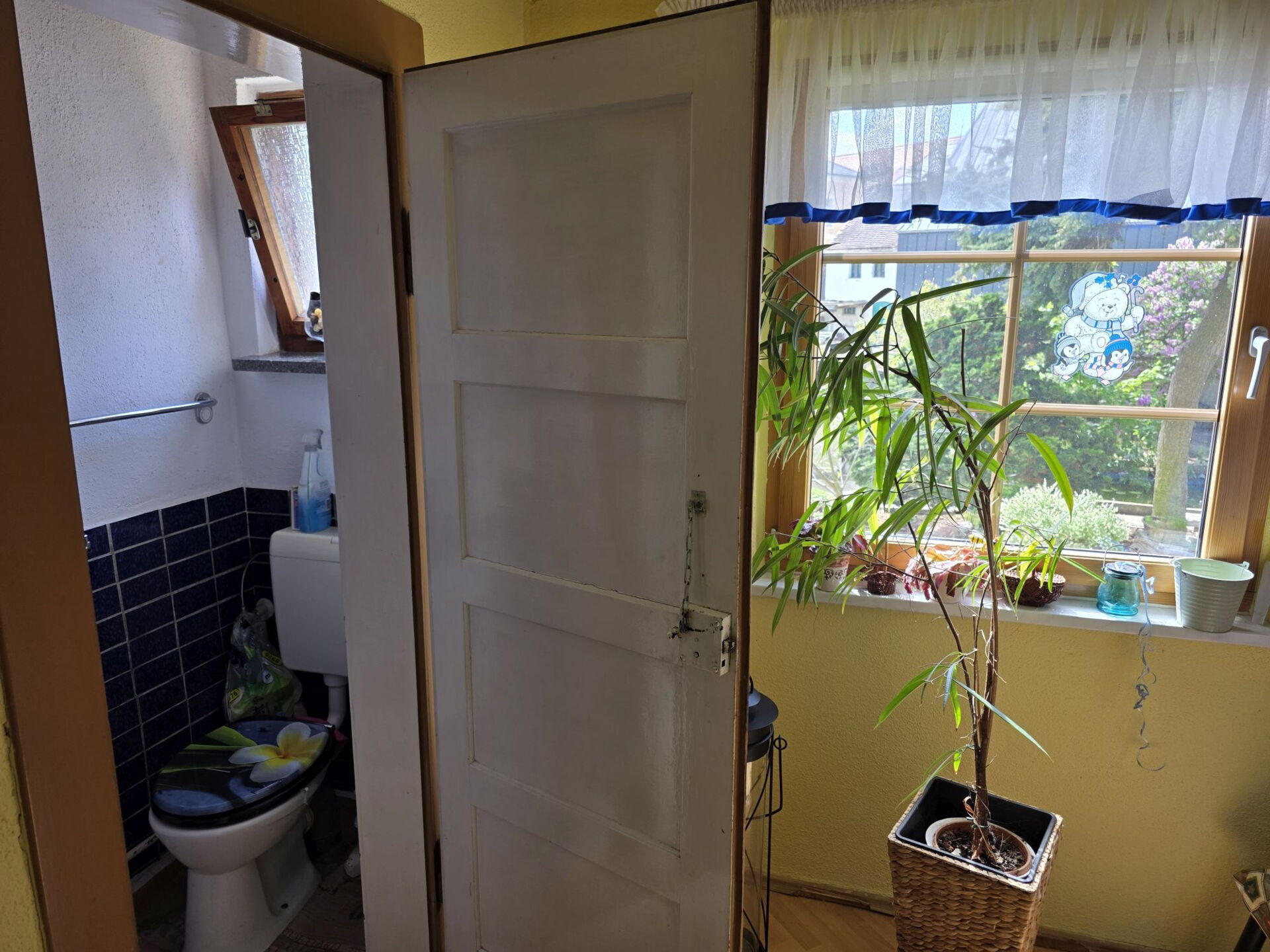 Derzeit ist nur eine Wohneinheit in sich abgeschlossen, diese befindet sich im rechten, hinteren Nebengebäude. Der Zugang hierfür ist zwischen der Garage und dem Wohnhaus auf den Bildern als solcher nur leicht zu erkennen. Die Wohneinheit besteht aus drei Zimmern, Bad (zweckmäßig-modern) und einer Küche. und einer großen Terrasse mit Zugang zum Garten