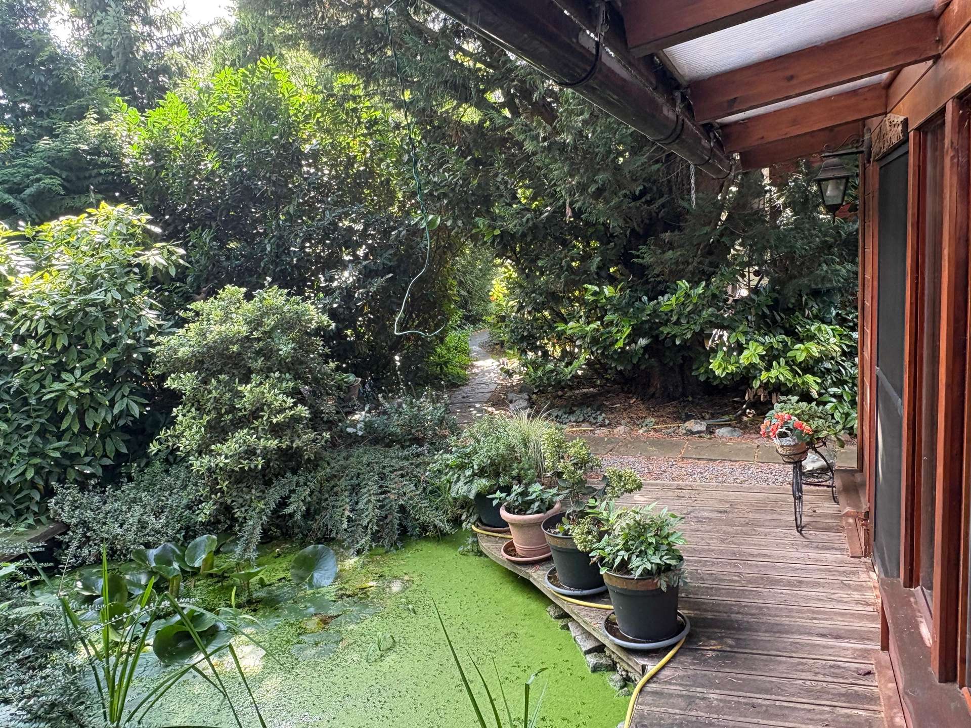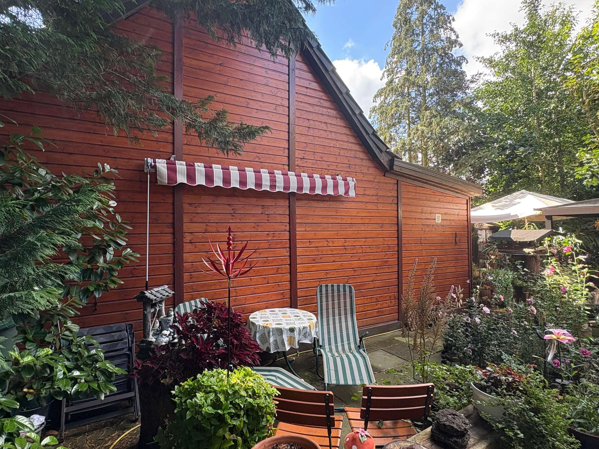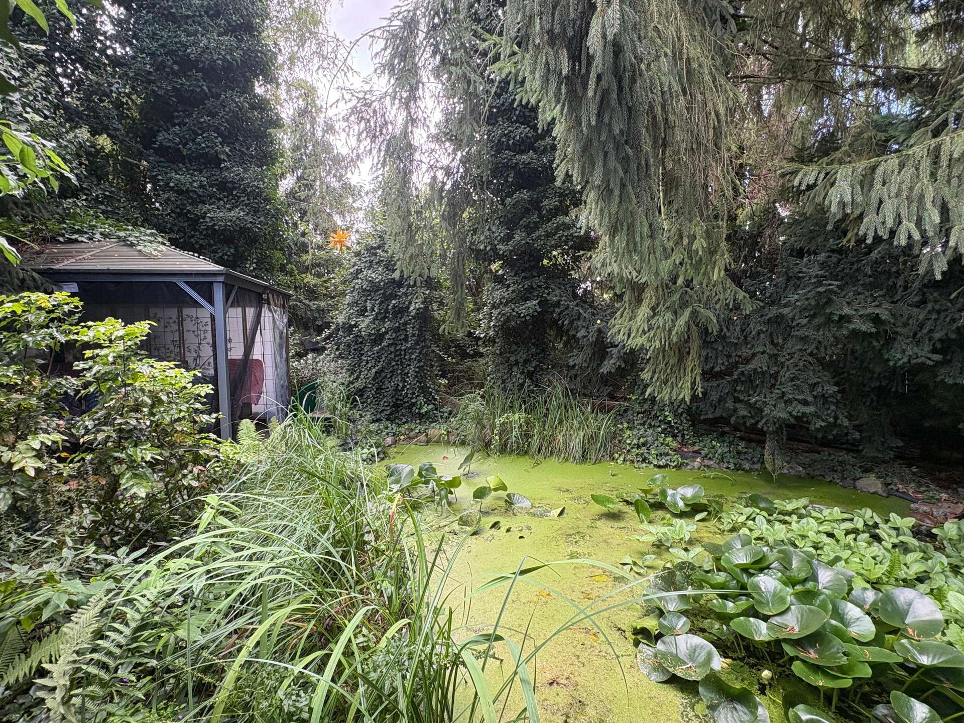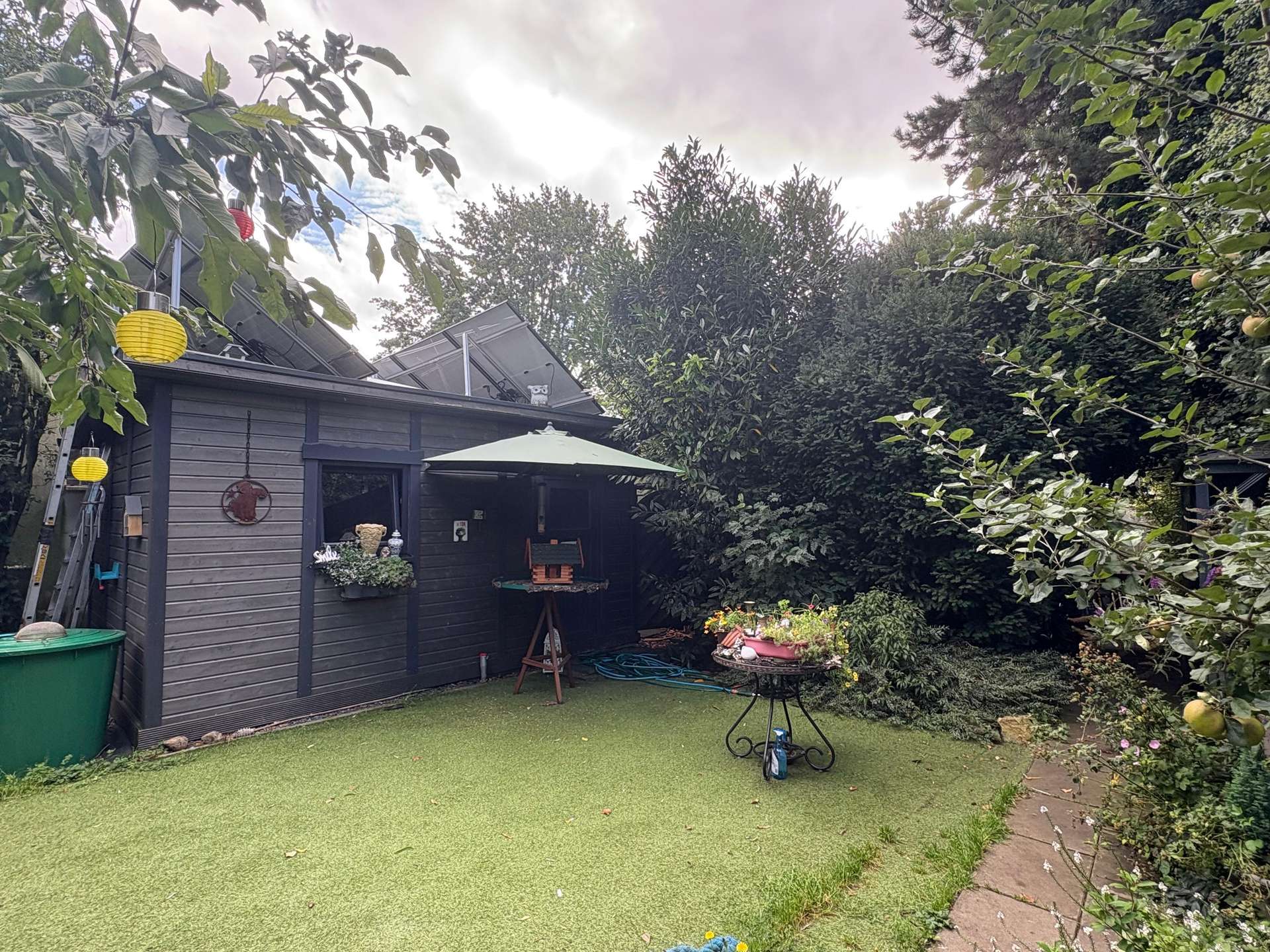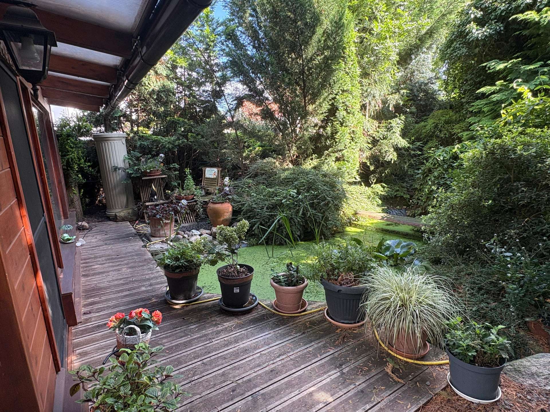 liebevoll angelegt mit mehreren Teichen und kleinen Ruheinseln bietet der Garten viel für seine Bewohner, Naturliebhaber, Hobbygärtner oder Ihre Gäste. Die Terrassen sind nach Süden ausgerichtet.