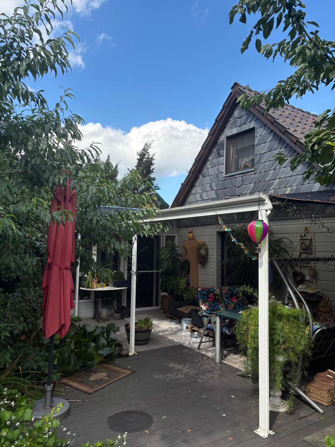 Das separate Gartenhaus in Holzbauweise ist vielfältig nutzbar, ob als Einliegerwohnung, Gästehaus, Büro, Atelier oder für größere Kinder, die Möglichkeiten sind groß. Es besteht aus zwei Schlafzimmern (eins im EG, das zweite im OG), Küche, Bad und einem großzügigen Wintergarten, dieser ist beheizbar und wird derzeit auch als Wohnzimmer genutzt.