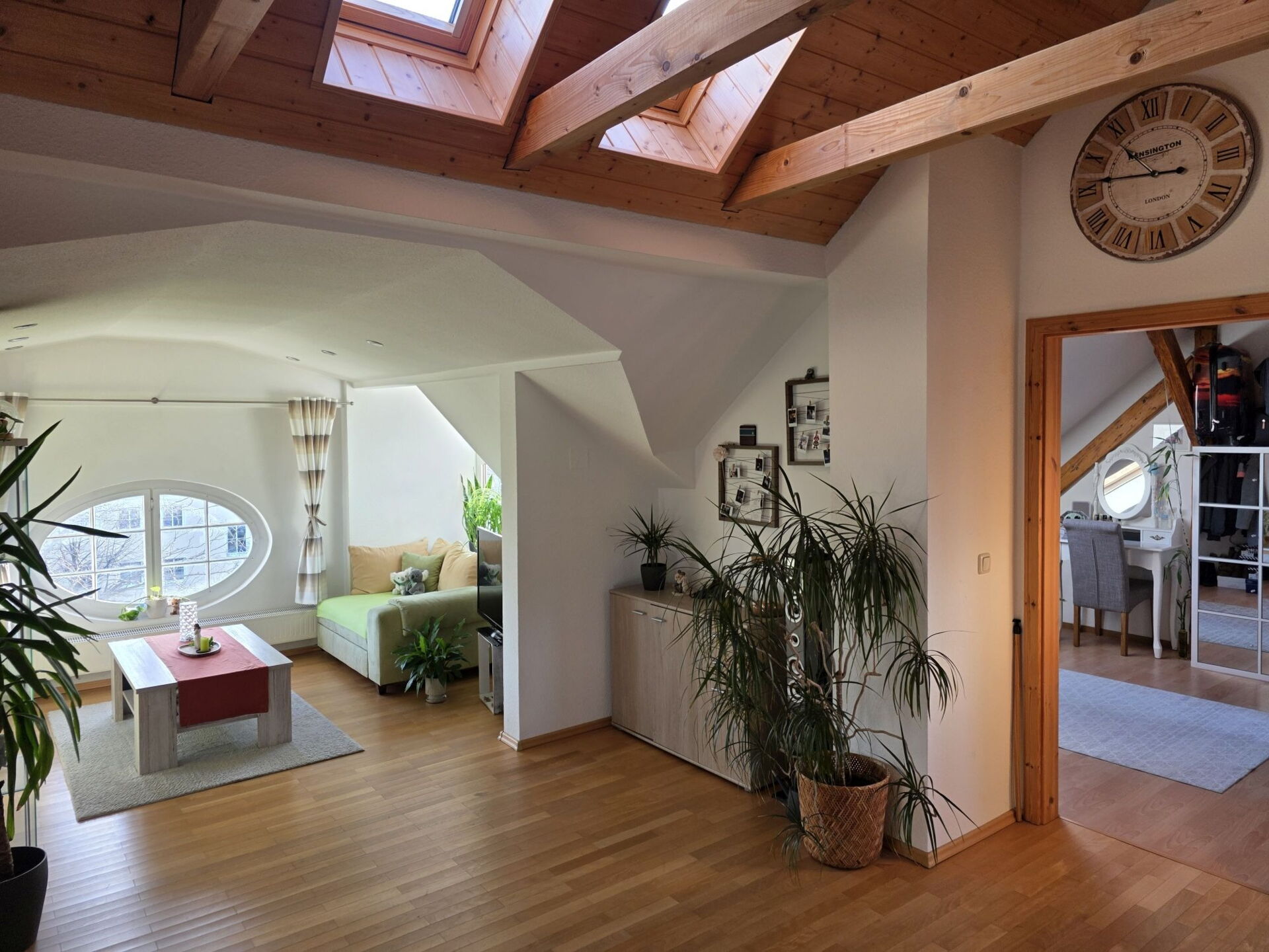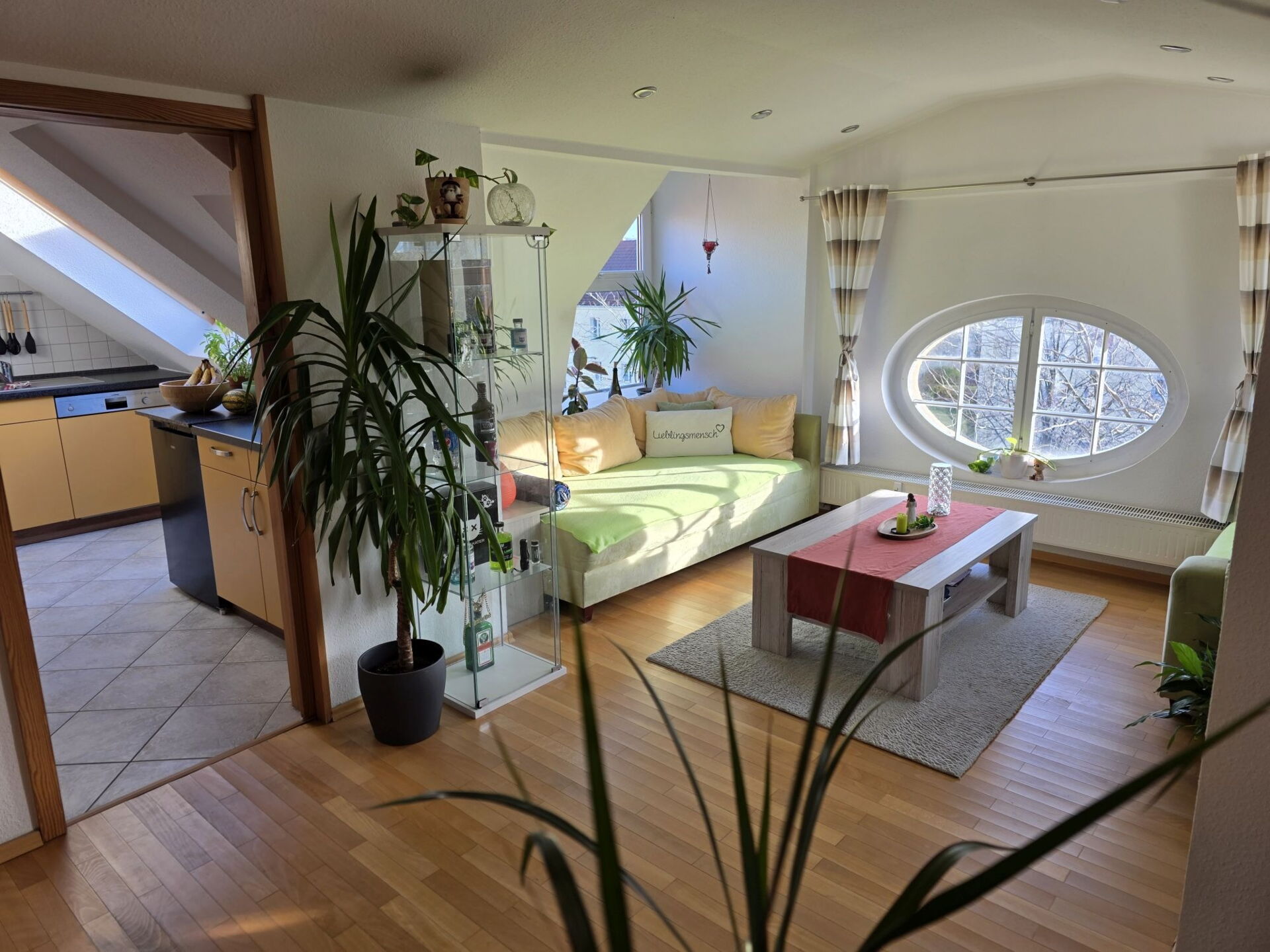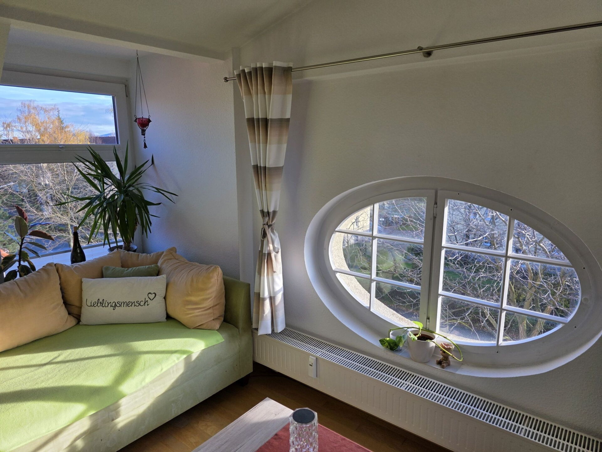 Auf rund 90 m² bietet sie ein gemütliches Wohnambiente mit einem offenen Raumgefühl und schönem Ausblick über die Dächer der Stadt.
